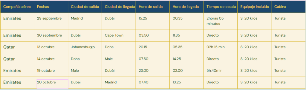Desayuno en el hotel. A la hora prevista traslado al aeropuerto para coger el vuelo que os llevará a Johanesburgo y de ahí embarque con Qatar para llegar hasta Maldivas.